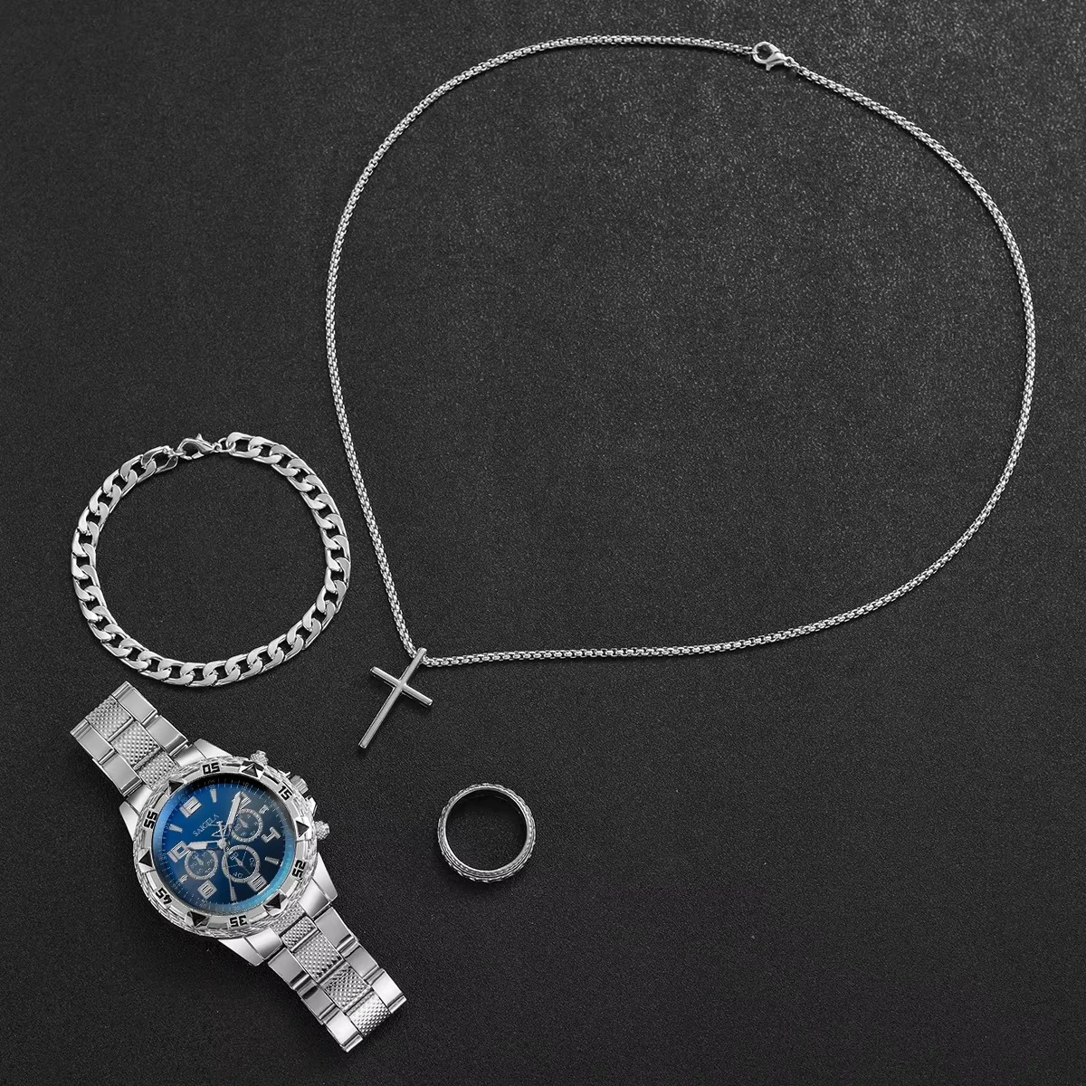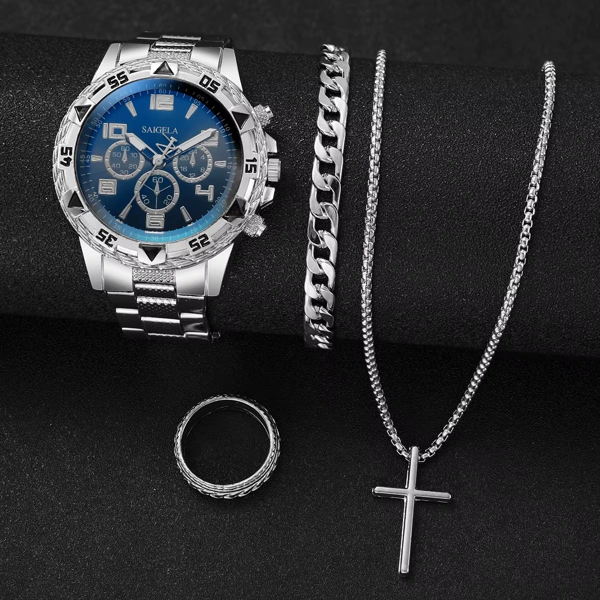 4pcs/set Men's Watches Fashion Arabic Dial Quartz Watch Male's Silver Band Wristwatches Jewelry Set (Without Box)