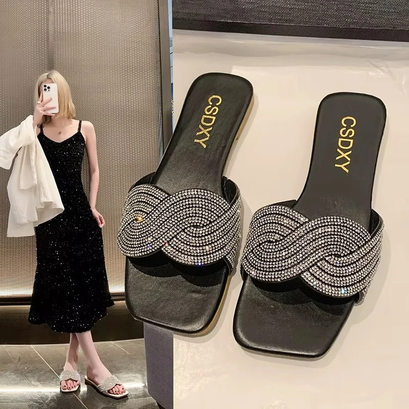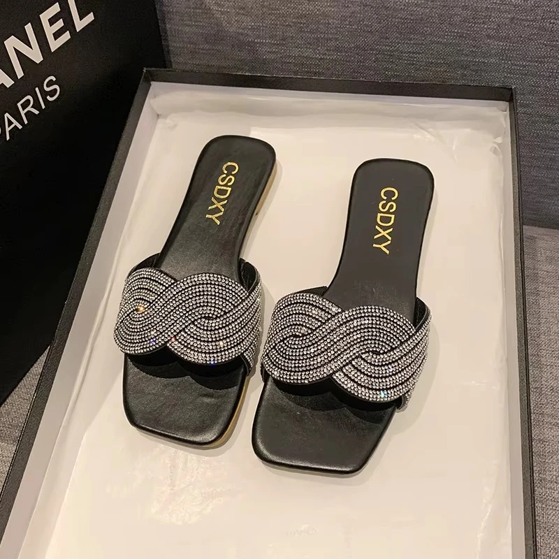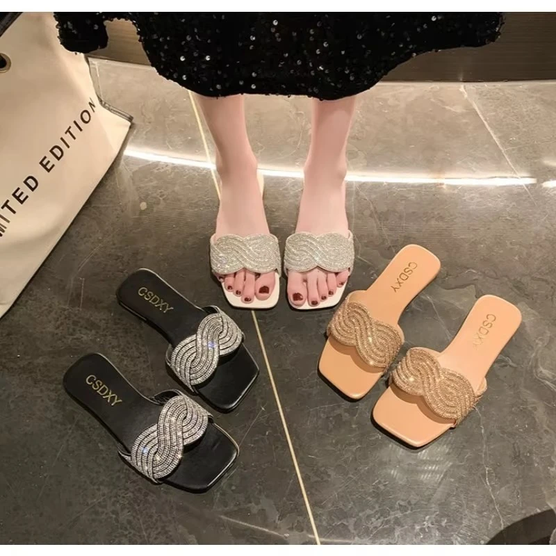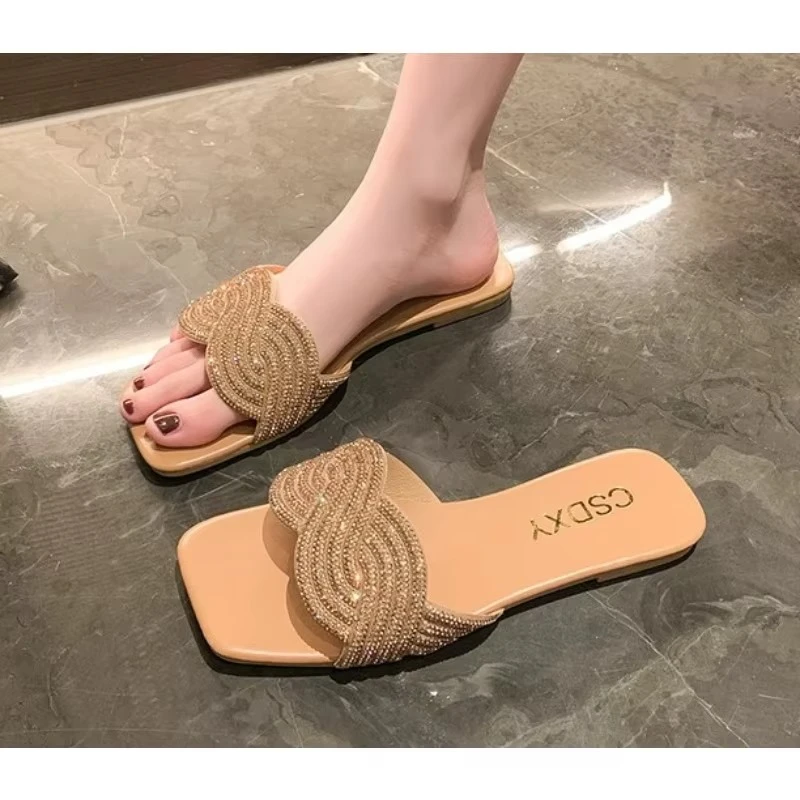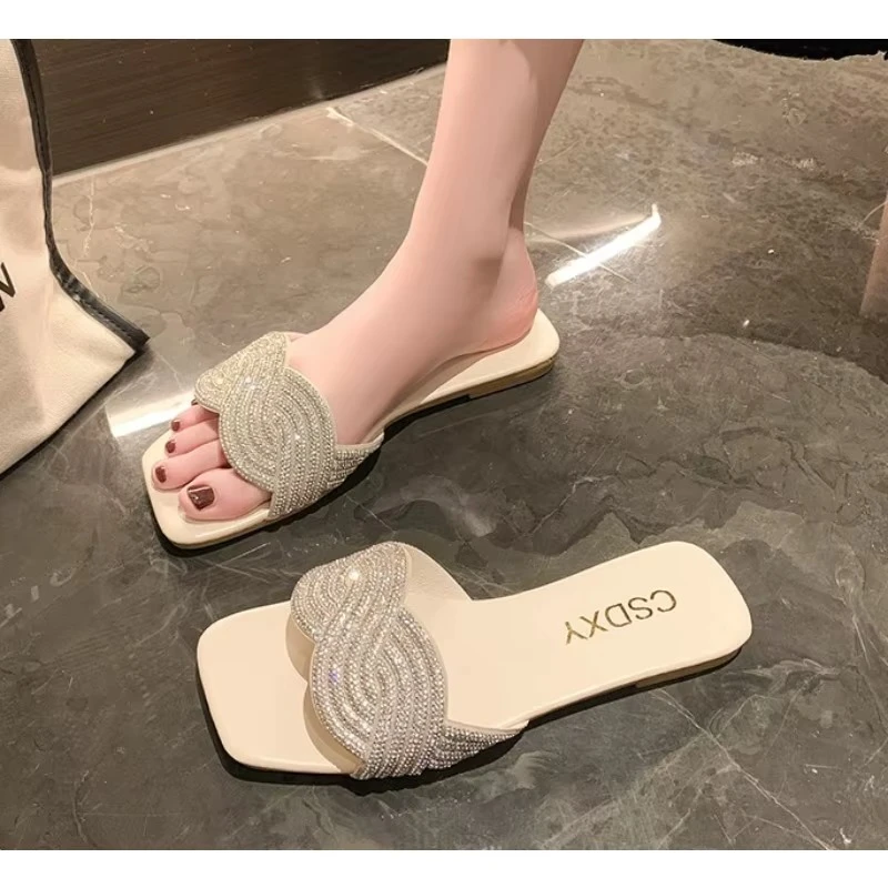 Summer New Flat Heel Rhinestone Slippers Women Fashion All-match Rhinestones Sandals Outdoor
